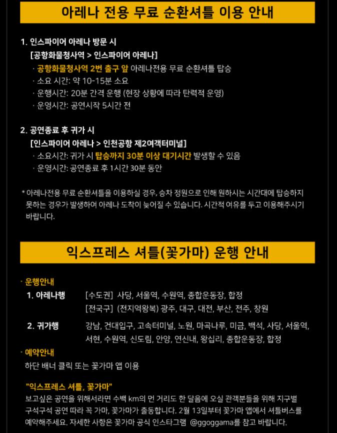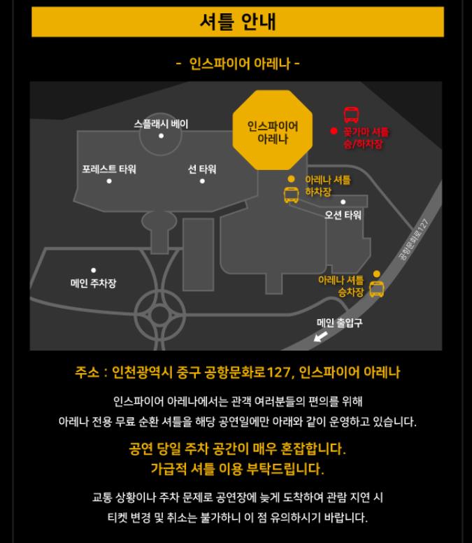 - 공연장이 인스파이어 영종도다 보니 아무래도 자가용이 없으신 분들은 셔틀 버스가 중요할 것 같습니다. 그리고 공연 당일 상당히 혼잡할 것으로 예상되어 편하게 셔틀 or 호텔에 투숙하는 것도 방법일것 같습니다.