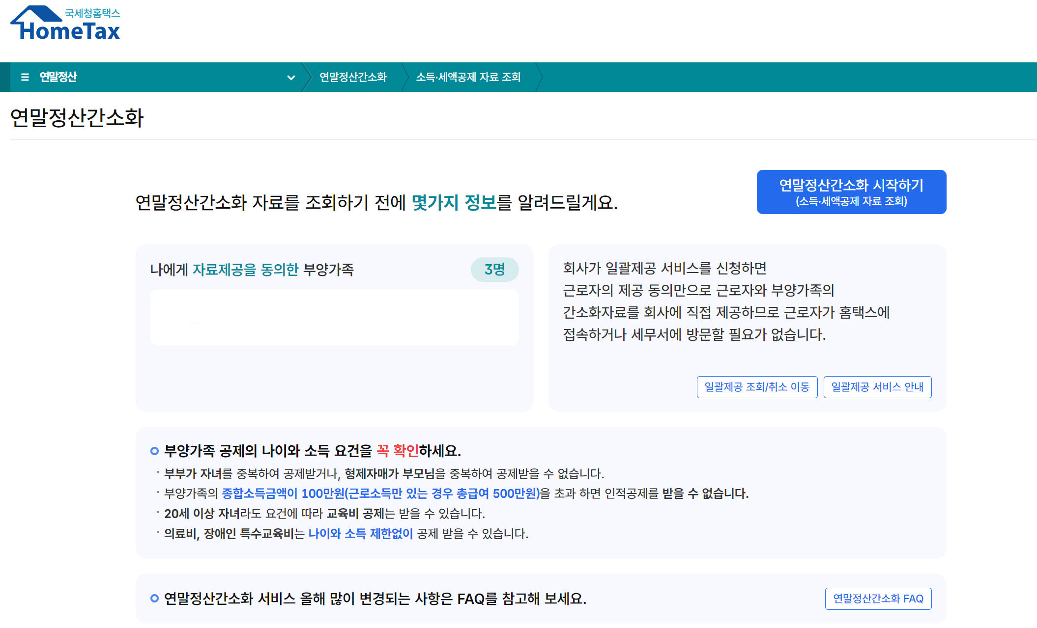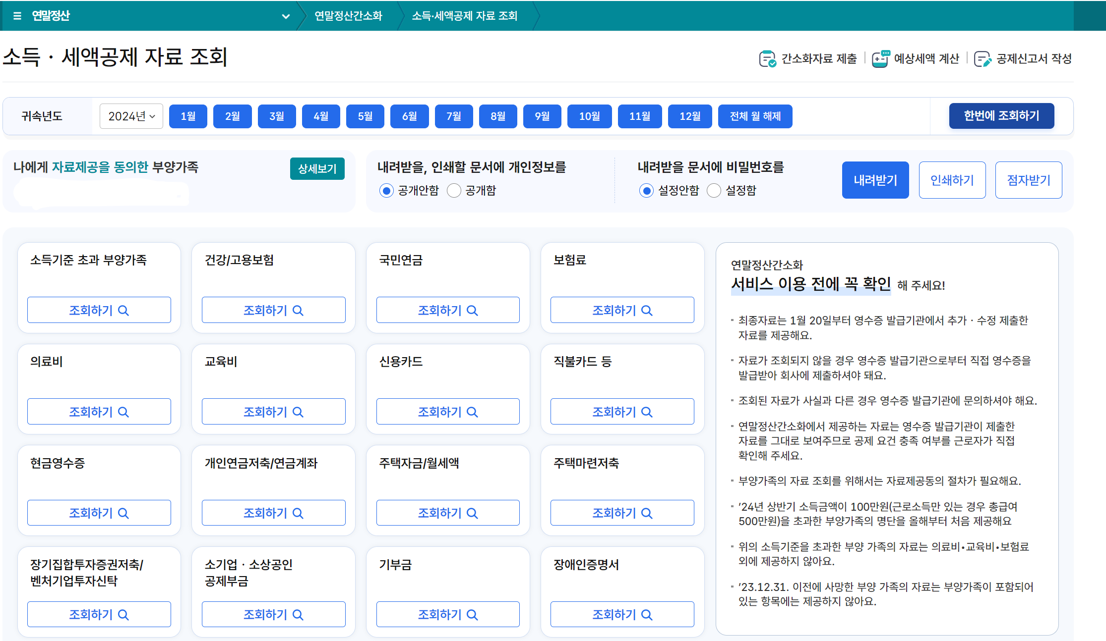 - 올해부터 2024년 상반기 소득금액이 100만 원(근로소득만 있는 경우 총 급여액 500만원)을 초과하는 부양가족의 명단을 제공한다고 합니다. 하지만 2023년 12월 31일 이전에 사망하였거나 소득금액 기준을 초과한 부양가족의 간소화자료는 제공되지 않는다고 합니다.