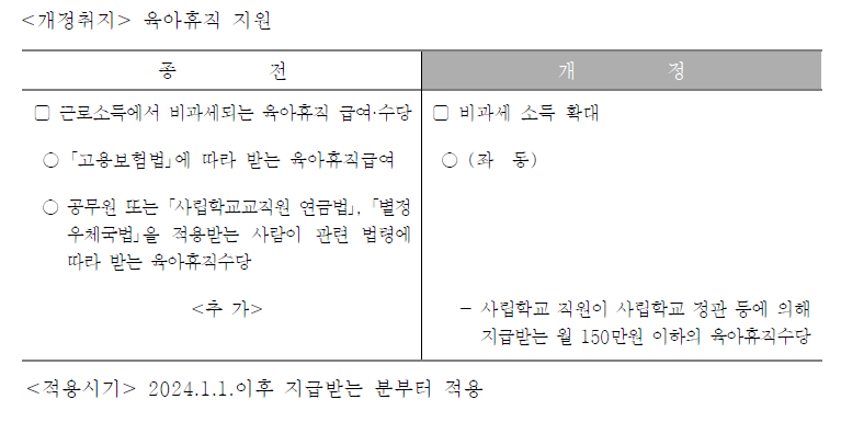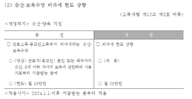 이외 육아휴직 지원, 출산 보육수당 비과세도 한도 상향, 의료비 세제 지원 강화 등이 있습니다.
