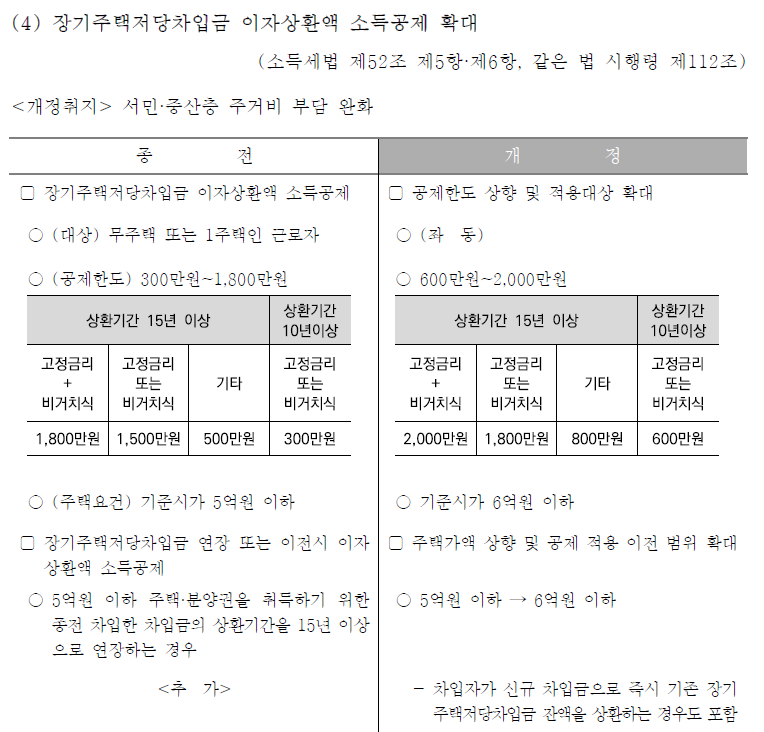 - 주택담보대출 및 월세액 공제 기준 완화