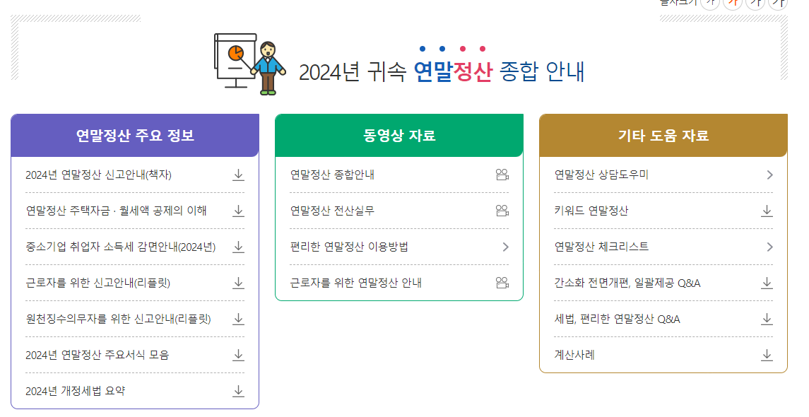 연말정산관련해서 추가 궁금한 사항이 있는 분들은 '연말정산 주요 정보' 가 국세청 홈페이지에서 확인 가능합니다. (링크)