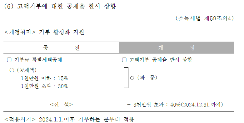 - 3,000만 원 초과 고액 기부금 공제율 상향
