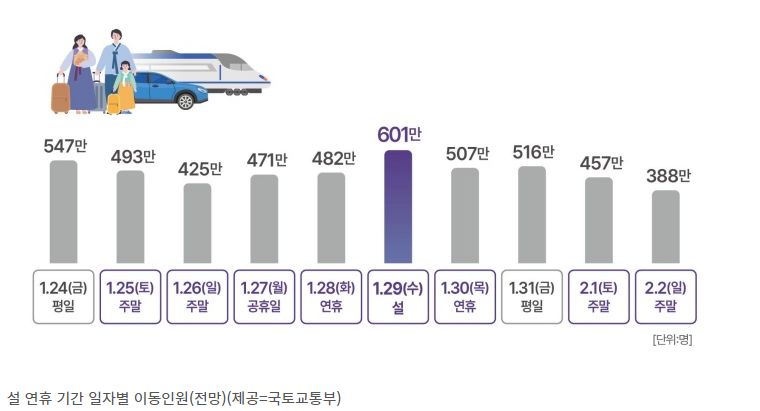 설 연휴 기간 언제가 가장 막힐지 다들 눈치 싸움을 하죠? 한국교통연구원에서 진행 한 설문조사에 따르면 1월 29일(수) 설 당일에 최대 601만 명이 이동 할 것으로 전망했는데요.
