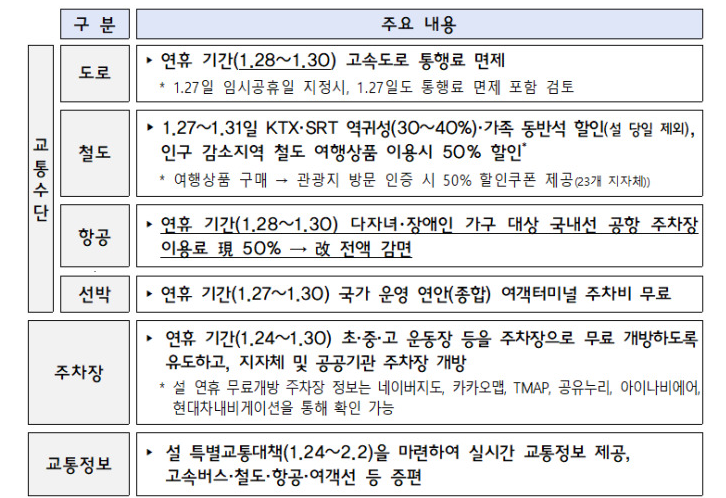 1월 27일부터 31일까지 KTX와 SRT 이용하는 역귀성 승객은 요금을 30~40% 할인 받을 수 있고, 설 당일 제외하고 가족 동반석 이용자도 요금 할인을 받을 수 있습니다.