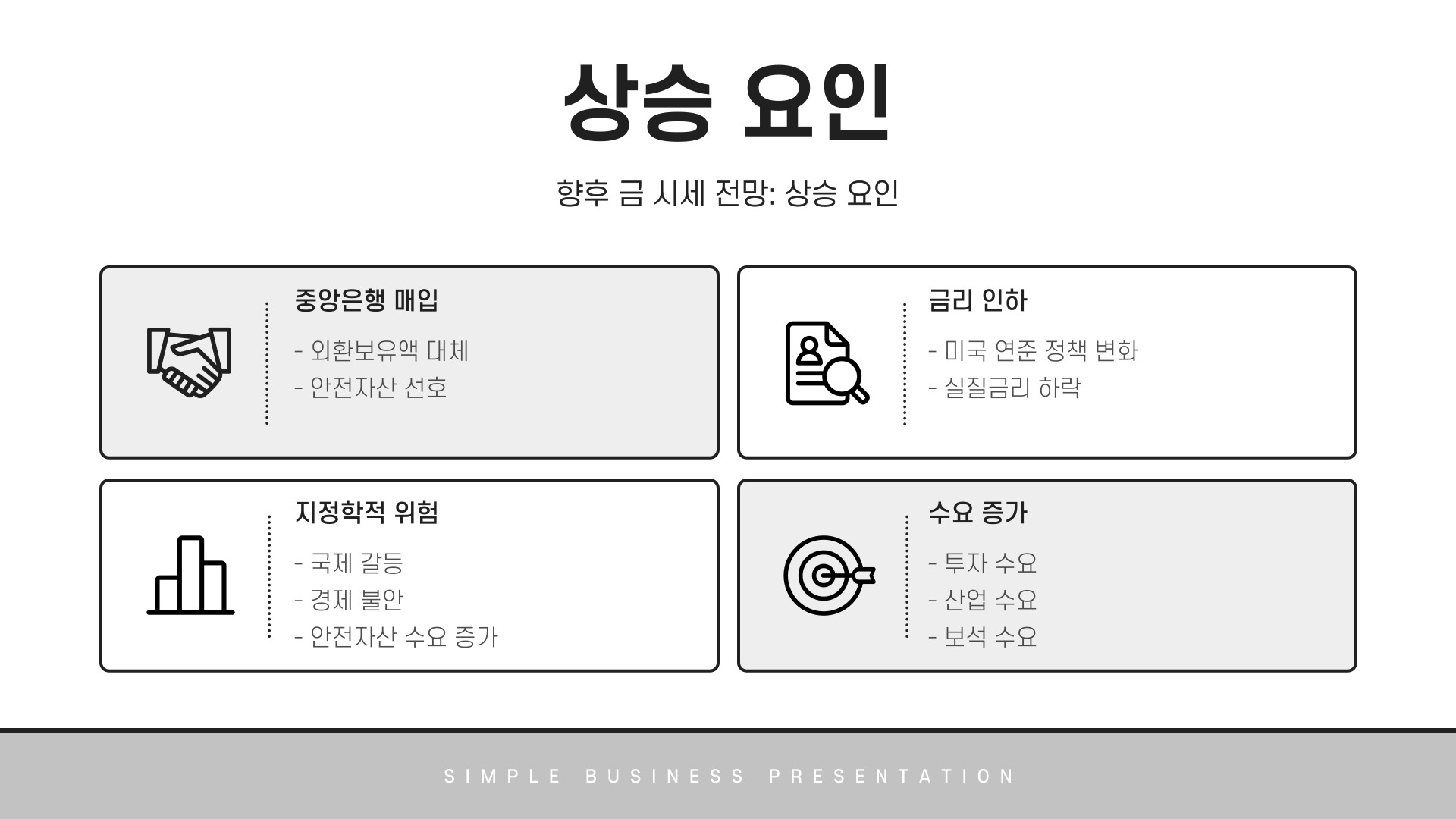 • 지정학적 리스크 증가: 글로벌 경제 불확실성과 지정학적 갈등으로 인해 안전자산인 금의 수요가 증가할 가능성이 큽니다.