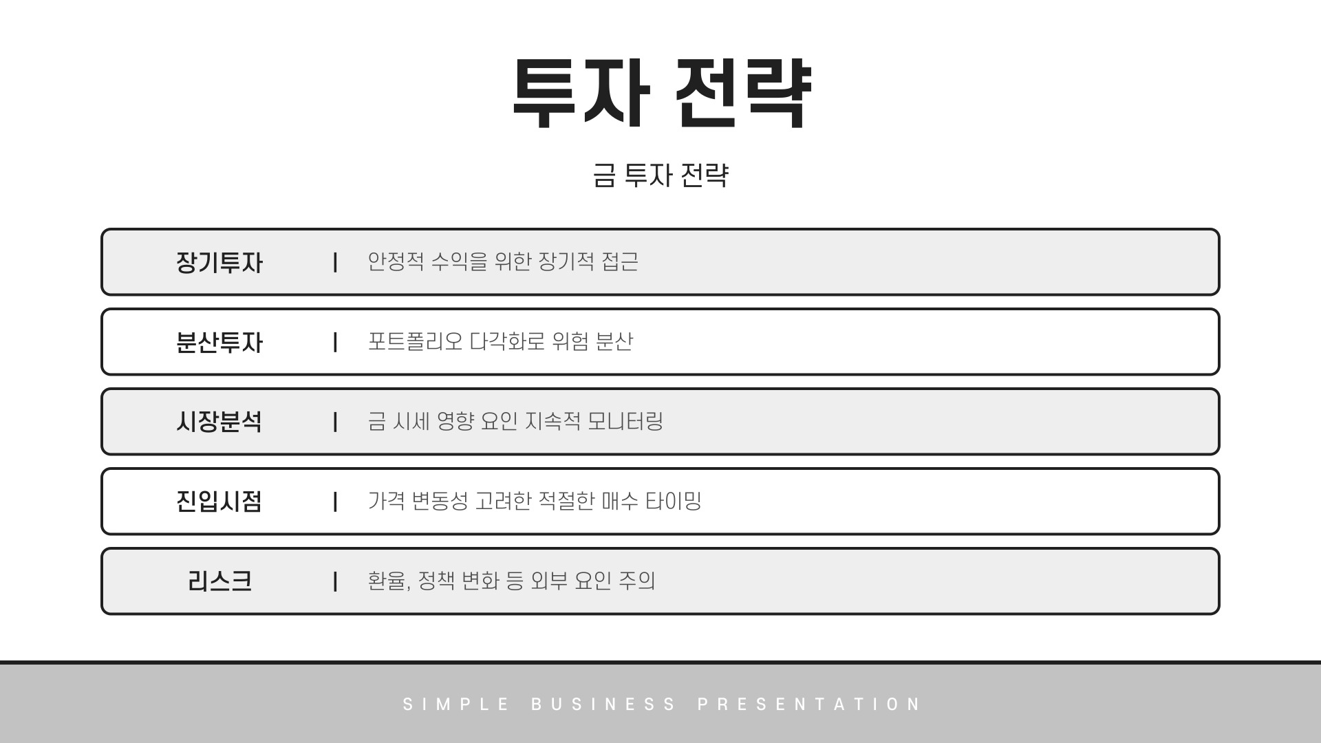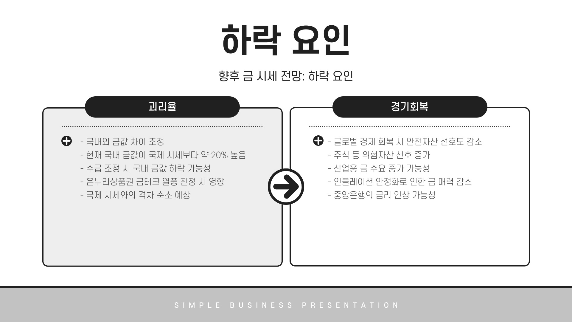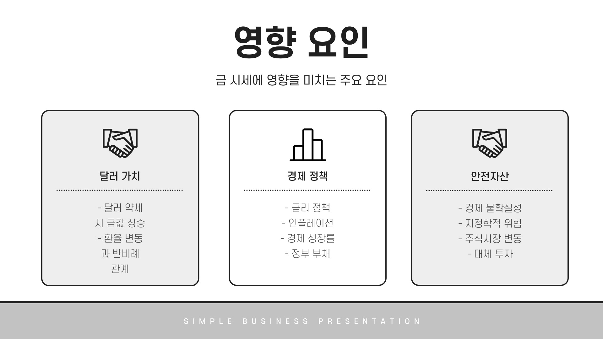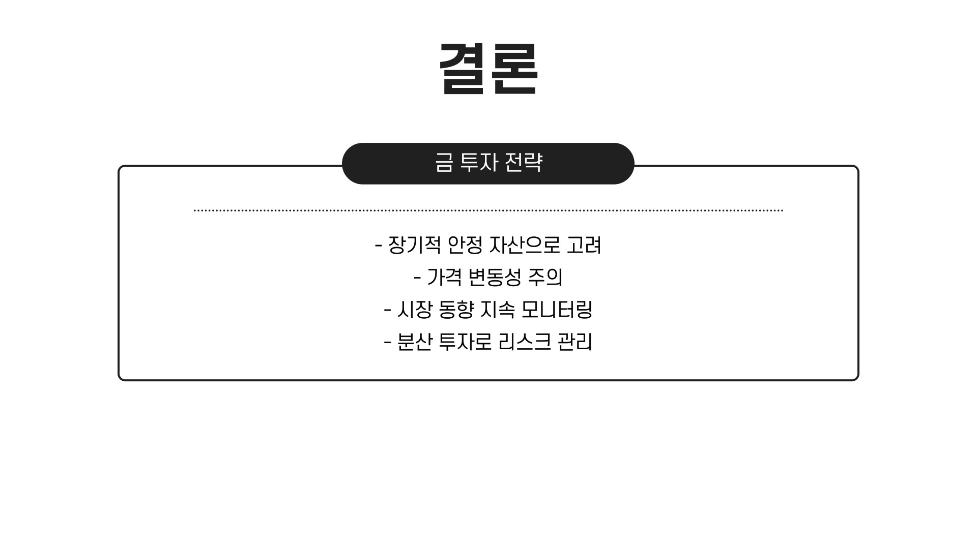 • 경기 회복 시 금 수요 감소 가능성: 글로벌 경제가 회복세를 보이면 투자자들의 안전자산 선호도가 낮아질 수 있습니다.
