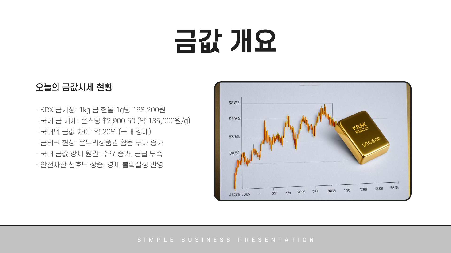한국거래소(KRX) 금시장에서 1kg 금 현물의 1g당 가격은 168,200원입니다. 이는 국제 금 시세보다 높은 가격대로, 국내 금값의 강세가 지속되고 있음을 보여줍니다. 금값에서도 김치 프리미엄이 적용되고 있습니다.