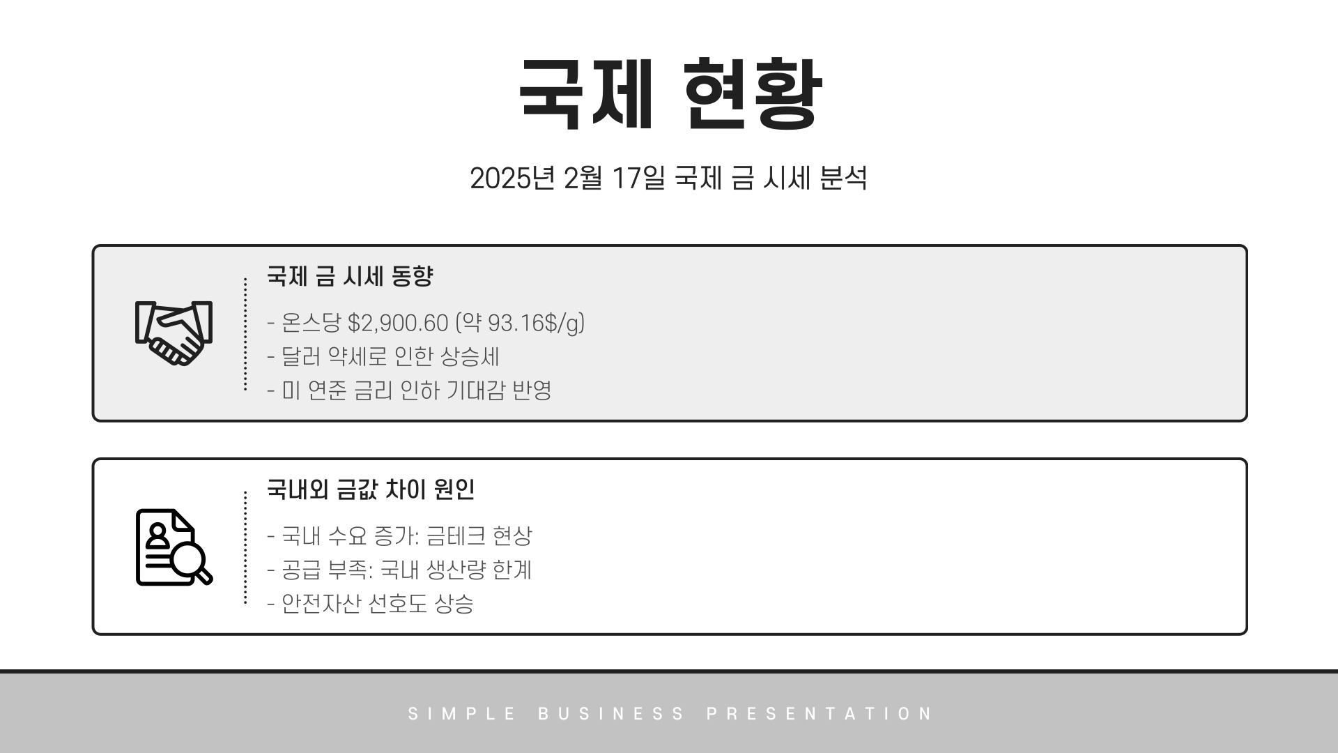 국제 금 시세는 온스당 $2,900.60으로, 1g당 약 $93.16(한화 약 135,000원) 수준입니다. 국내 금값과 비교하면 약 20%의 가격 차이가 발생하고 있으며, 이는 한국의 금 수요 증가와 공급 부족 현상이 반영된 결과입니다.