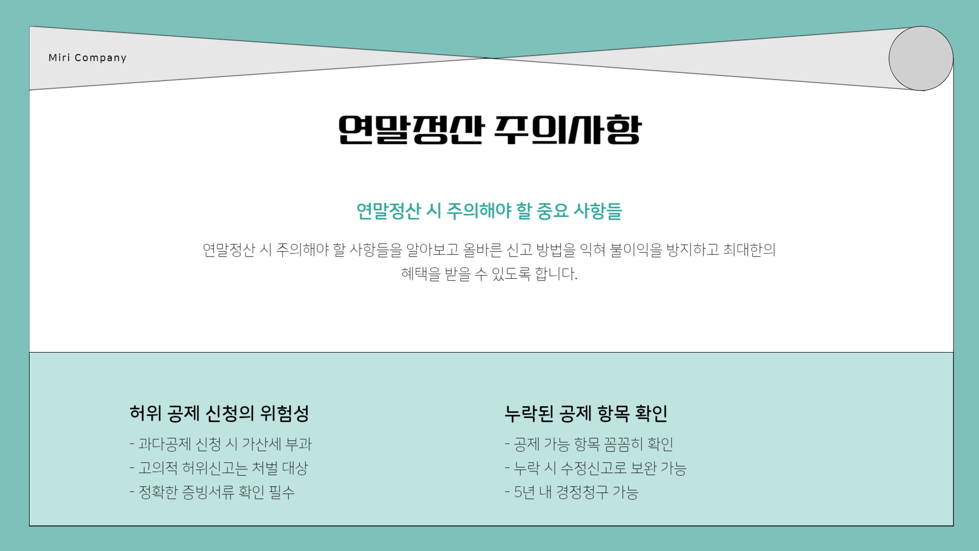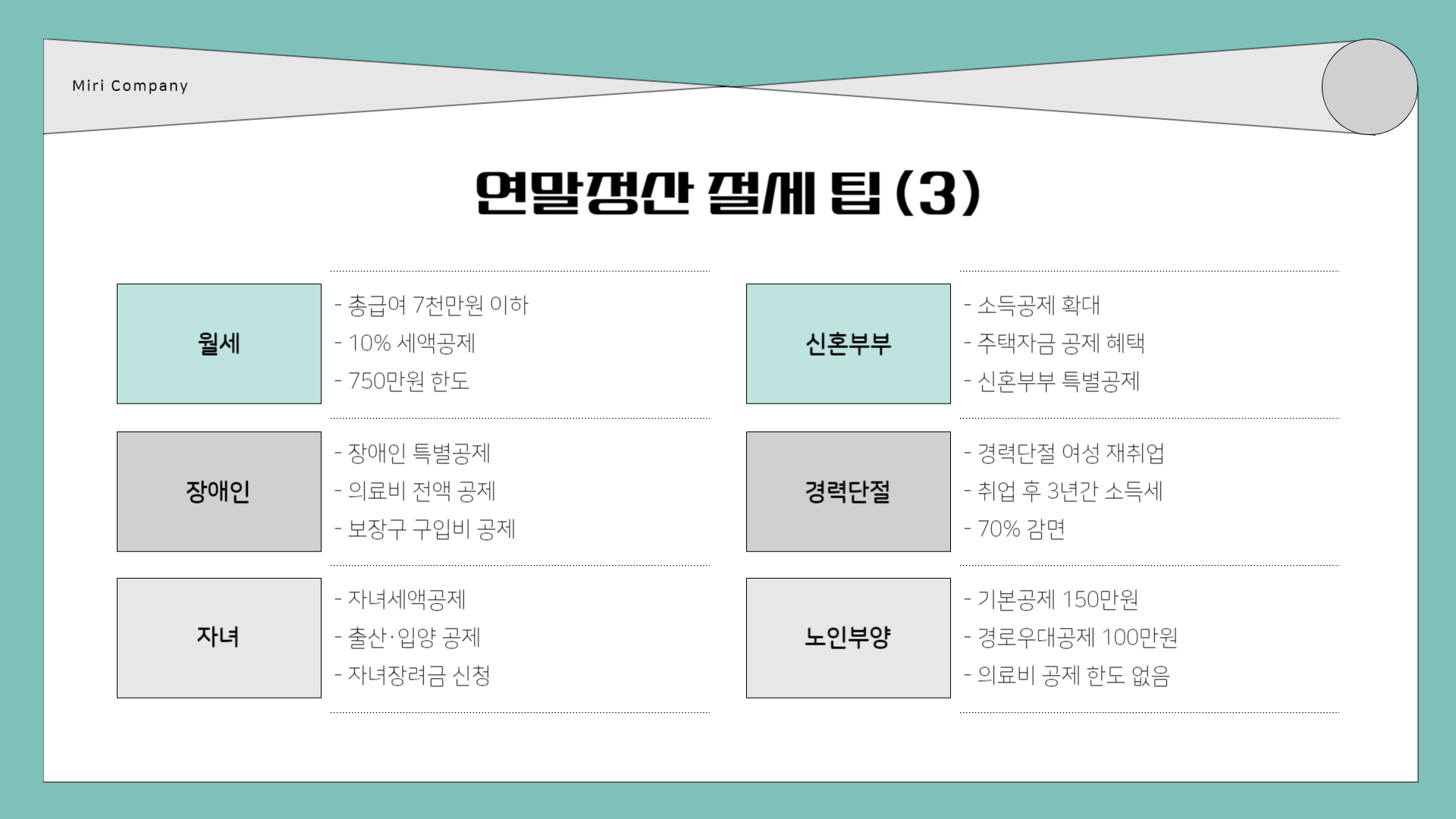 • 본인, 배우자, 부양가족의 의료비 및 교육비는 세액공제 대상이므로 증빙 서류를 꼭 제출하세요.