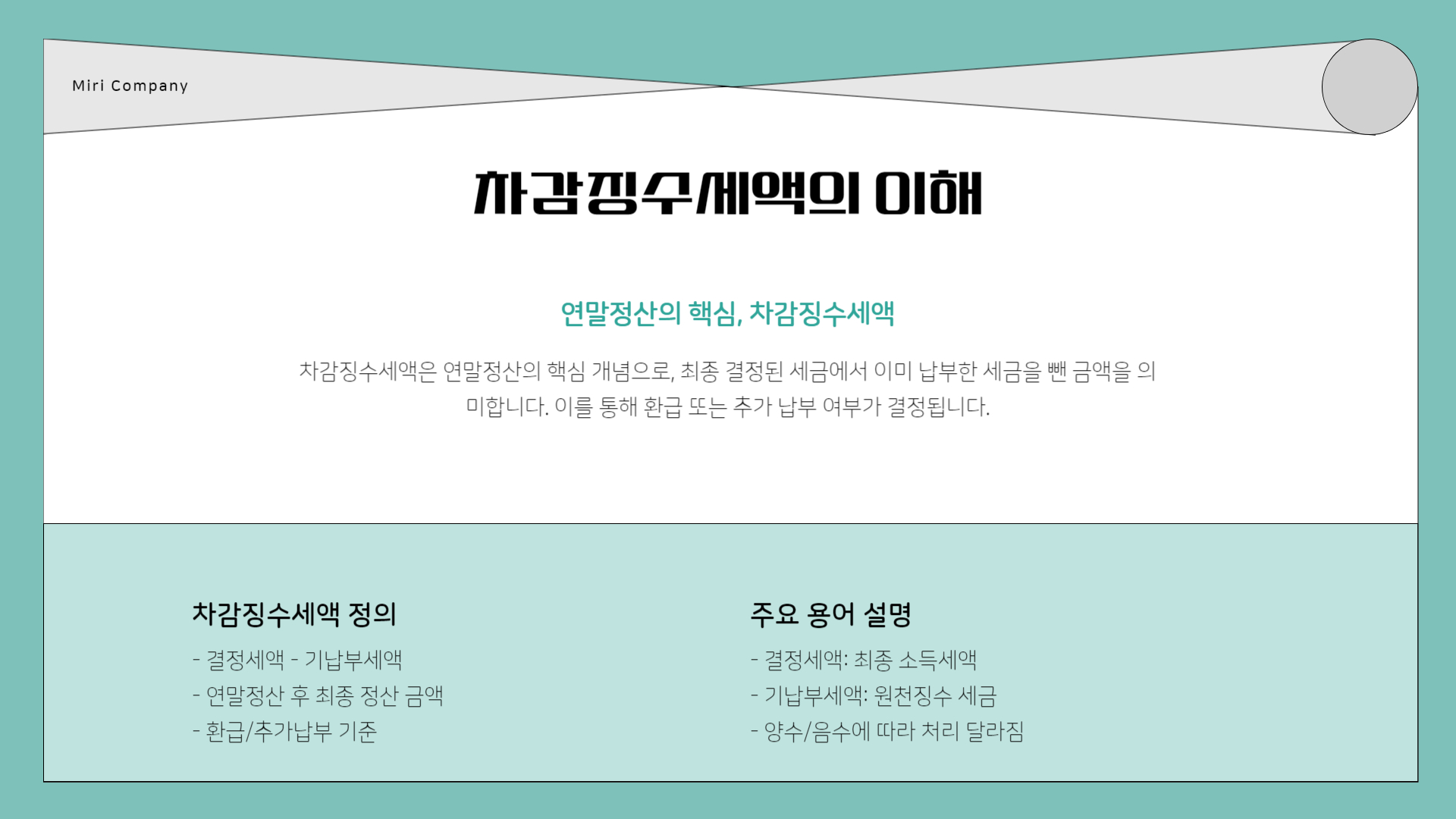 매년 초가 되면 직장인들에게 중요한 일정이 하나 있습니다. 바로 연말정산입니다. 많은 사람들이 연말정산을 통해 세금 환급을 기대하지만, 일부는 예상과 다른 결과를 받아 당황하기도 합니다. 특히, 차감징수세액이라는 용어를 처음 접하는 경우 이해하기 어려울 수 있습니다. 이번 글에서는 연말정산의 기본 개념과 함께 차감징수세액이 무엇인지, 환급금 조회 방법까지 쉽게 정리해보겠습니다.