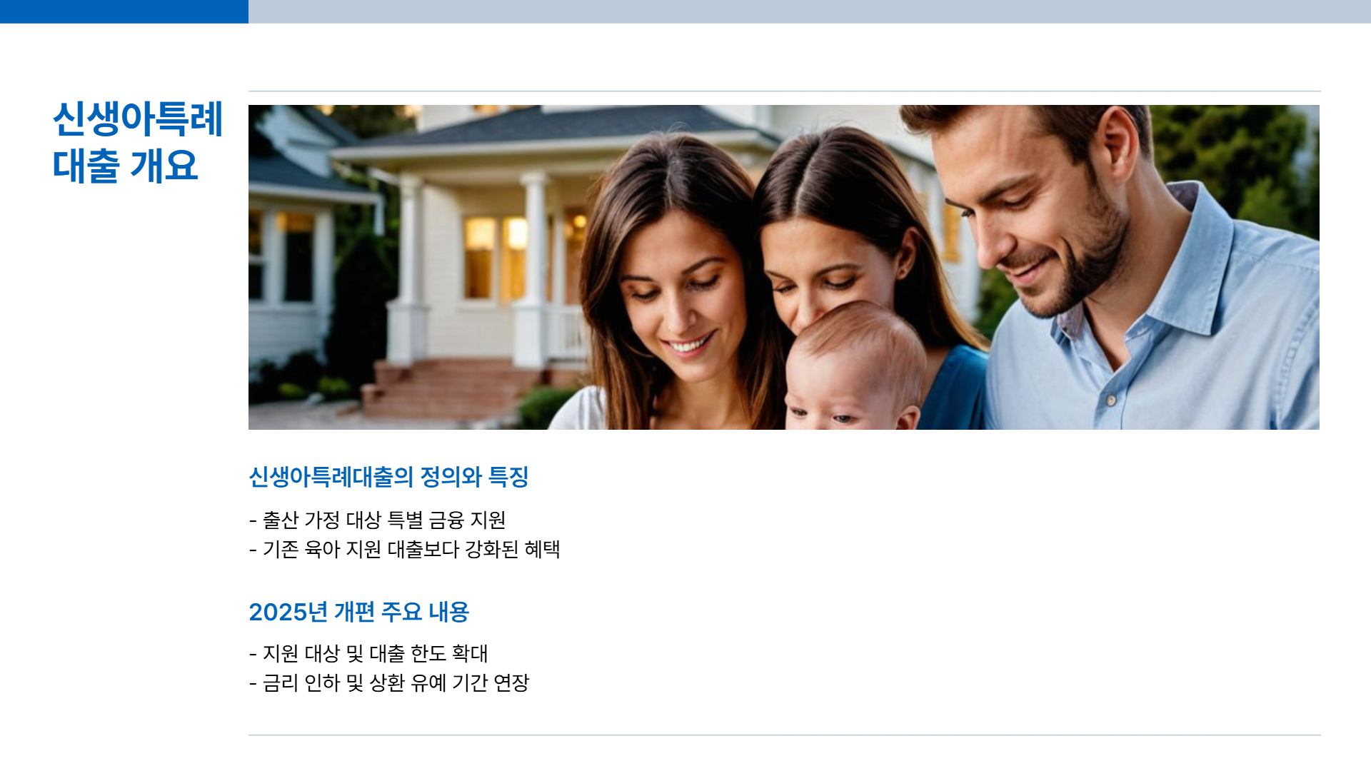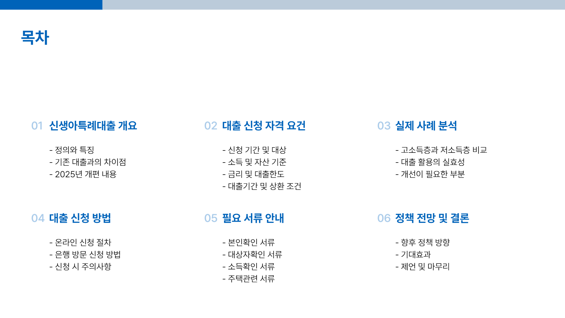 | 목차 01. 신생아 특례대출 개요 02. 대출 신청 자격 요건 03. 실제 사례 분석 04. 대출 신청 방법 05. 필요 서류 안내 06. 정책 전망 및 결론 |