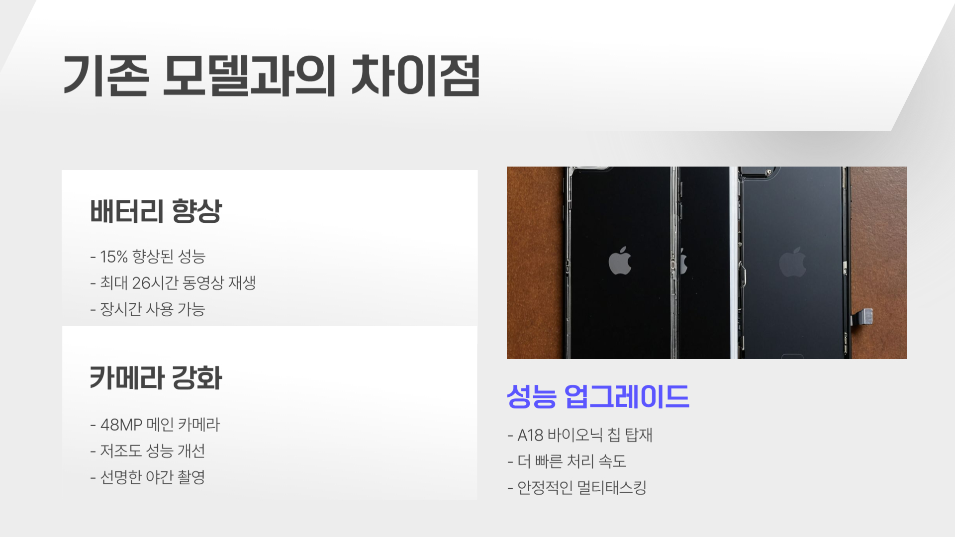 아이폰16e는 아이폰15 시리즈와 비교했을 때 몇 가지 눈에 띄는 변화가 있습니다. 특히 다음과 같은 업그레이드 요소들이 주목할 만합니다.